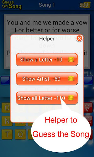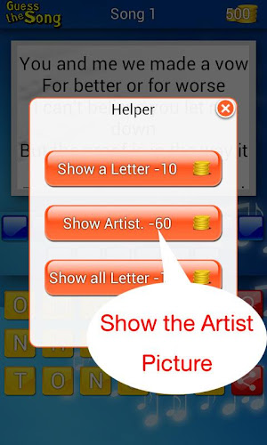let’s guess the song the hint to show the artist or song name and use helper to show the letters, the picture of artist, and show all the song name.