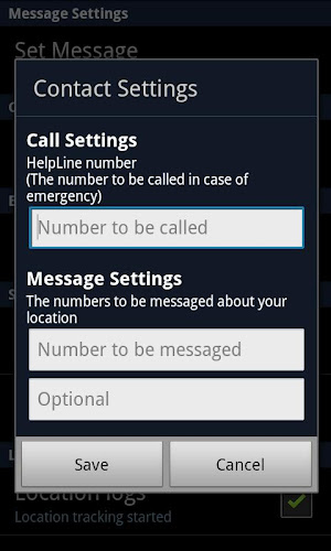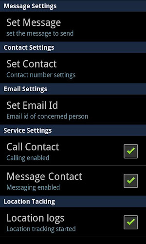 Email Setting included in settings menu - once you click the help button along with call and message, an email would be sent every minute to the mail id provided. The email would continue to be sent until you click the stop mail option from the menu of application. If you fail to click the stop button the email sending would be stopped after one hour.