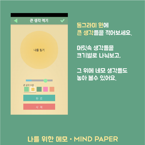 MIND PAPER는 머릿속의 고민, 생각들을 하나하나 적어보는 것을 제안합니다.