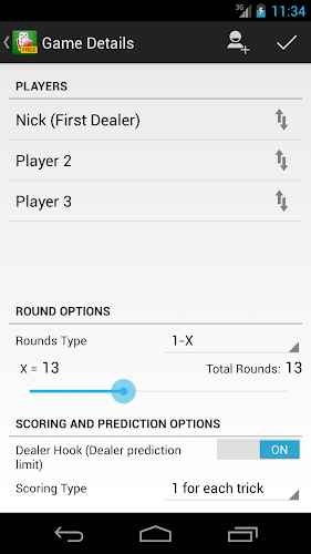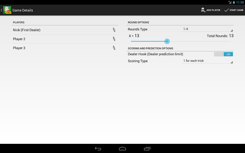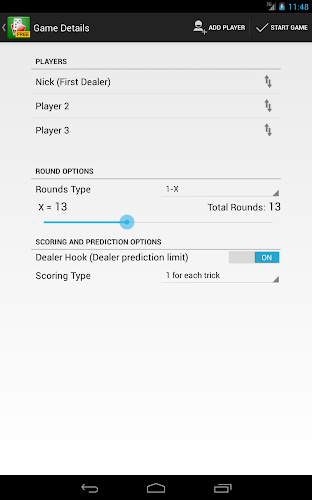 Můžete do své hry snadno přidat hráče, vybrat, kolik kol chcete hrát (včetně kol (včetně kol (včetně kol (včetně kol (včetně Možnosti jednoho a dvojitého paluby) a můžete si dokonce vybrat různé typy kol. Například, kolik karet se vypořádat, kdo je předpověď a kdo nejprve leží. Hra znovu se stejnými lidmi.