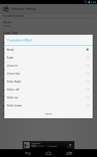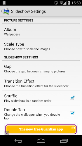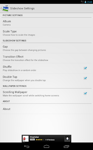 Obrázek Slideshow Live tapeta. Můžete změnit řadu možností, jako je složka vašich obrázků, typ měřítka, přechod a délka času mezi obrázkyMůžete také provést změnu obrázku, když dvojitá klepání na svou domovskou obrazovku