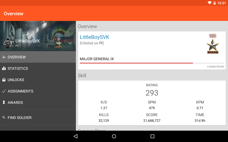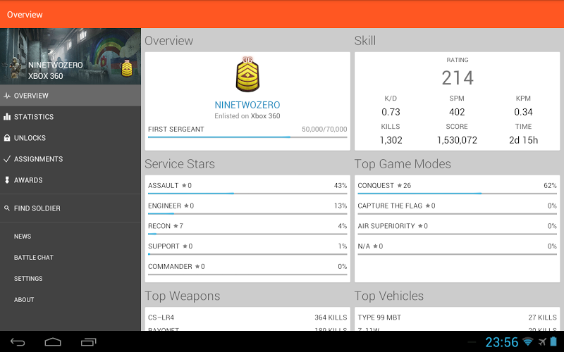 Přemýšleli jste někdy nad tím, jak by vypadaly vaše herní seance, kdybyste měli přístup ke všem informacím, které potřebujete, přímo před vámi, aniž byste museli stisknout klávesu Alt nebo se přesouvat z té vaší pohodlné pohovky? Tady je řešení!BF4 Intel je váš nejdůvěryhodnější společník na Battlefieldu bez ohledu na platformu, na které hrajete, nebo kolik lidí máte ve skupině. V současné době si můžete prohlížet své statistiky, odemknutí, úkoly a ocenění a navíc přidanou funkci pro zobrazení nejnovějších zpráv z Battlelogu! Většina lidí má při hraní své telefony vedle sebe, což z této aplikace činí dokonalou aplikaci pro všechny hráče – nebudete muset mít svůj notebook zapnutý jako konzolový hráč, jen kvůli Battlelogu. K vyhledání aktuálních odemknutí a promeškání důležitých herních příležitostí není nutné používat alt-tabu hry. Stačí otevřít aplikaci, zkontrolovat, co potřebujete, a zahrát si svá nejlepší kola všech dob.