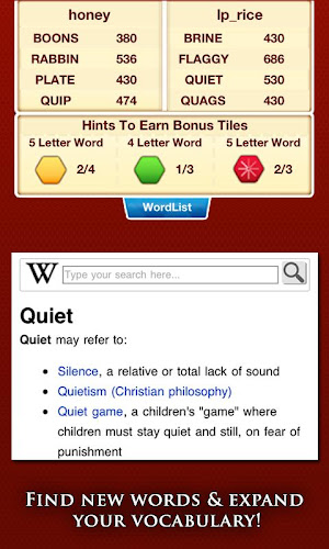 Volání všech šampionů slov! Zažijte vzrušení z Wordplay, když propojujete dopisy ke sledování slov na krásné voštinové struktuře. Vytvořte delší slova vzácnými písmeny, abyste získali statné body a odemkli úkoly! Hrajte s naší rychle rostoucí komunitou hráčů a spřátelit se slovními profesionály z celého světa.