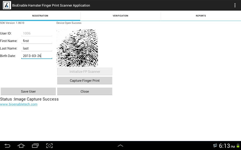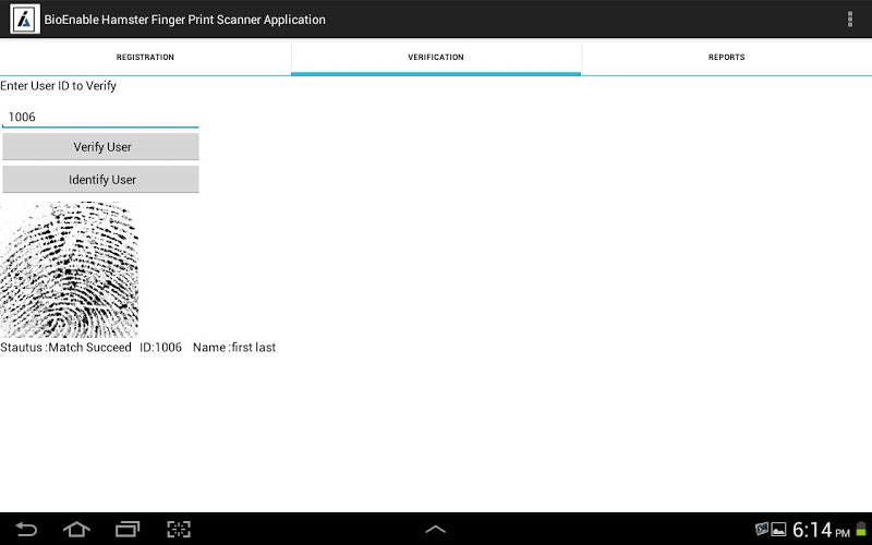 Tato aplikace je pro účel časové účasti s bioenabilním skenerem pro tisk prstu (křeh). být generován pro tohoto uživatele. (Uloží šablonu otisků prstů ve formátu ISO 19794-2 formát / aadhaar otisků prstů)2) Ověření - Tento modul obsahuje dvě možnosti ověřit a identifikovat pro ověření časového razítka uživatele a protokolování.