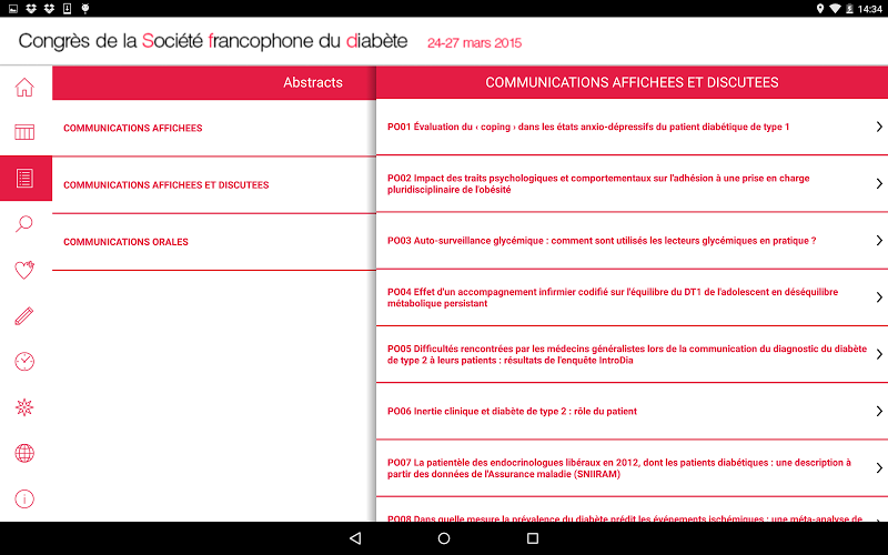 Najděte abstrakty Komunikační výroční konference Francophone Society of Diabetes od 24. do 27. března ve výstavním centru Bordeaux.Aplikace Elsevier Masson provedená s institucionální podporou Astra Zeneca.