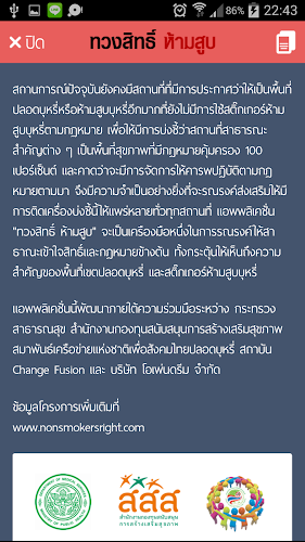 สถานการณ์ปัจจุบันยังคงมีสถานที่ที่มีการประกาศว่าให้เป็นพื้นที่ปลอดบุหรี่หรือห้ามสูบบุหรี่อีกมากที่ยังไม่มีการใช้สติ๊กเกอร์ห้ามสูบบุหรี่ตามกฏหมาย เพื่อให้มีการบ่งชี้ว่าสถานที่สาธารณะสำคัญต่าง ๆ เป็นพื้นที่สุขภาพที่มีกฎหมายคุ้มครอง 100 เปอร์เซ็นต์ และคาดว่าจะมีการจัดการให้คารพปฎิบัติตามกฏหมายตามมา จึงมีความจำเป็นอย่างยิ่งที่จะรณรงค์ส่งเสริมให้มีการติดเครื่องบ่งชี้นี้ให้แพร่หลายทั่วทุกสถานที่ แอพพลิเคชั่น "ทวงสิทธิ์ ห้ามสูบ" จะเป็นเครืองมือหนึ่งในการรณรงค์ให้สาธาณะเข้าใจสิทธิ์และกฎหมายข้างต้น ทั้งกระตุ้นให้เห็นถึงความสำคัญของพื้นที่เขตปลอดบุหรี่ และสติ๊กเกอร์ห้ามสูบบุหรี่แอพพลิเคชั่นนี้พัฒนาภายใต้ความร่วมมือระหว่าง กระทรวงสาธารณสุข สำนักงานกองทุนสนับสนุนการสร้างเสริมสุขภาพ สมาพันธ์เครือข่ายแห่งชาติเพื่อสังคมไทยปลอดบุหรี่ สถาบัน Change Fusion และ บริษัท โอเพ่นดรีม จำกัด