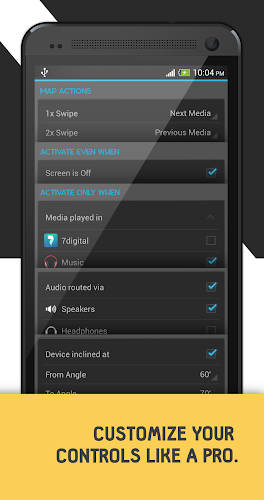 - Ovládací prvky mohou být hluboce nakonfigurovány tak, aby jim povolily pouze v určitých aplikacích (nebo), když zvuk přehrával na reproduktorech a Bluetooth (nebo), když se telefon naklonil v určitých úhlech (nebo) několika dalšími způsoby.
