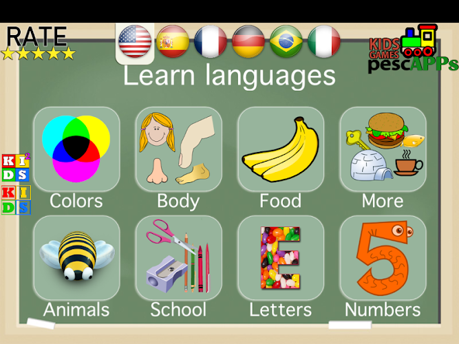 S touto hrou se děti naučí více než 120 slov (barvy, části těla, čísla, dopisy, ovoce, zvířata ...) v různých jazycích.obsahuje následující jazyky: angličtina, španělština, francouzská, německá, portugalština a italština.