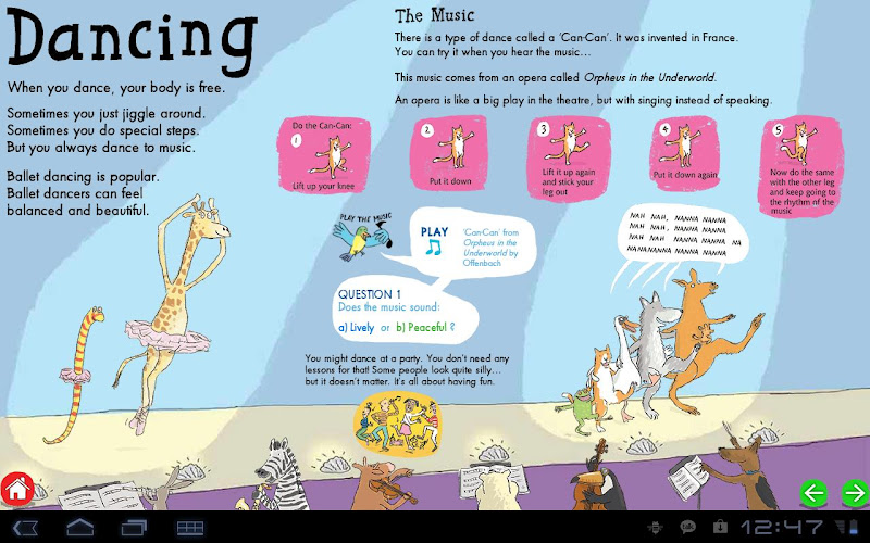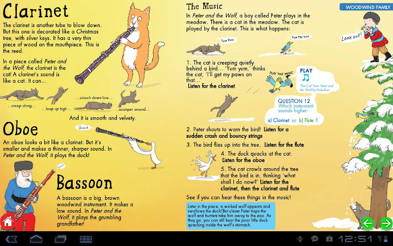 Klepněte na některá slova nebo obrázky a uslyšíte vyprávěný text, extrakty hudby a desítky animací a zvukových efektů. Zvířata mohou tančit, zpívat a hrát!