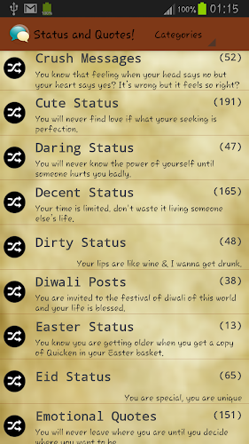 Analýza A Revize Aplikací Pro Android: Status Posts and Quotes, Vyvinuté Společností piapps. Uvedeno V Kategorii Sociální Síť. Aktuální Verze Je 1.5, Aktualizována Na 01/07/2016 . Podle Recenzí Uživatelů Na Google Play: Status Posts and Quotes. Dosaženo Více Než 138 Tisíc Instalací. Status Posts and Quotes Má V Současné Době Recenze 1 Tisíc, Průměrné Hodnocení 4.4 Hvězd