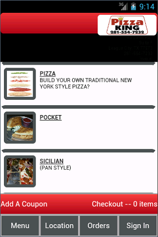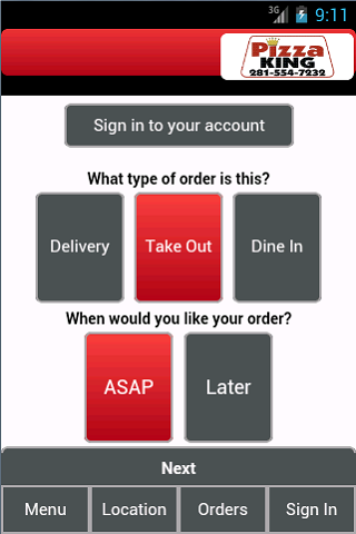 toto je aplikace pro Android pro krále pizzy, která se nachází ve státě League City. pomocí této aplikace si můžete objednat své oblíbené produkty pizza King online. pro více informací nás prosím navštivte na http://www.pizzakingtexas.com/pro zadání objednávky, nejprve zadejte typ objednávky a dejte nám vědět, zda si přejete objednat nyní, co nejdříve, nebo zadat objednávku na později. pak klikněte na další.
