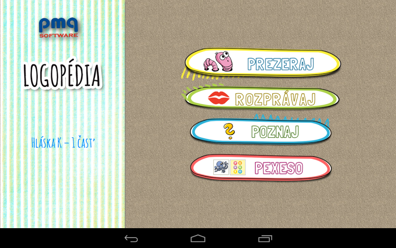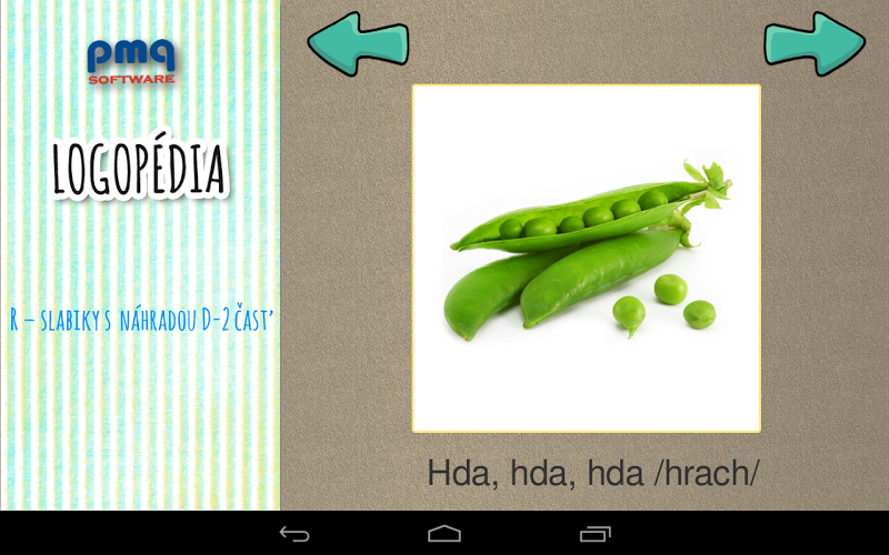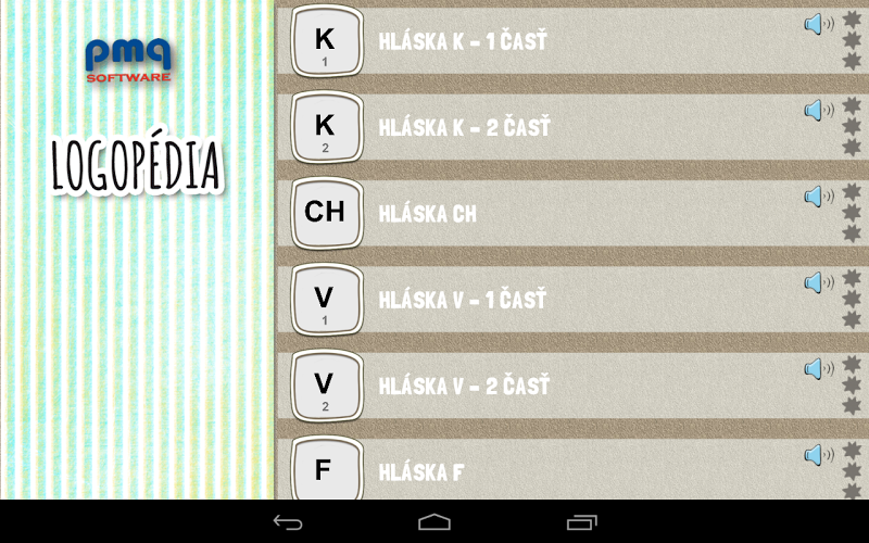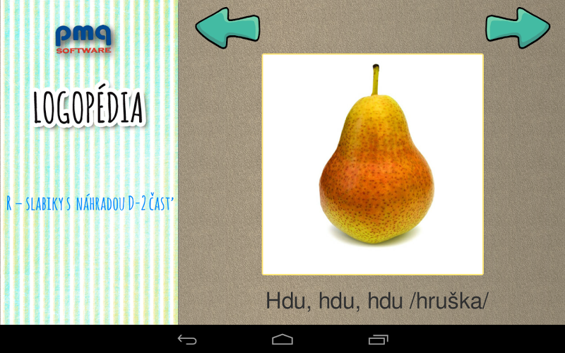 Program logoperie pomáhá při opravě správné výslovnosti zvuků - K, CH, V, F, L, L, ľ, ľ, ď, Č., Č., Š, Š, Ž, C, Z, Povrchová střídání C, S, Z - Č, Č. Rodiče a pedagogové, všichni, kteří se podílejí na rozvoji komunikačních dovedností u dítěte. V operačním systému Android si dítě může prohlížet obrázky, procvičovat výslovnost ve srovnání s nahráváním, seznámit se s obrázky a přehrávat paměťovou hru. Pořadí slov je určeno metodikou vytváření jednotlivých zvuků. Uznání slov je vyhodnoceno vstupem s datem a počtem nesprávně specifikovaných obrázků, které lze zvláště praktikovat ve funkci -error -můžete zkusit pracovat s aplikací na písmeny K, CH, Free, další část je nabitý. (3,55 EUR)Naše další vyučovací hry: