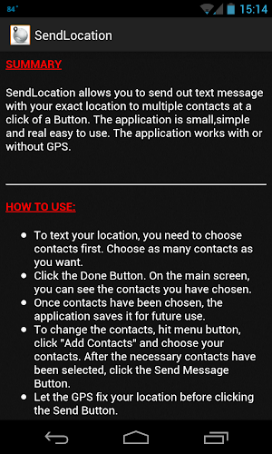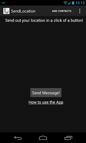 Představte si situaci, kdy jste v restauraci na večeři a váš přítel vám volá a ptá se na cestu. místo toho, abyste mu vysvětlili cestu, jednoduše mu pošlete sms s aplikací a váš přítel si může rovnou otevřít sms v google maps a připojit se k vám. sendlocation vám umožňuje odeslat textovou zprávu s vaší přesnou polohou více kontaktům jediným kliknutím na tlačítko. aplikace je malá, jednoduchá a opravdu snadno se používá.• Chcete-li odeslat zprávu o své poloze, musíte nejprve vybrat kontakty. zde si můžete vybrat tolik kontaktů, kolik chcete.