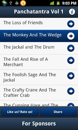 Analýza A Revize Aplikací Pro Android: Panchatantra Vol1, Vyvinuté Společností Programmerworld. Uvedeno V Kategorii Knihy A Referenční Materiály. Aktuální Verze Je 1.0.6, Aktualizována Na 21/12/2012 . Podle Recenzí Uživatelů Na Google Play: Panchatantra Vol1. Dosaženo Více Než 30 Tisíc Instalací. Panchatantra Vol1 Má V Současné Době Recenze 146, Průměrné Hodnocení 4.0 Hvězd