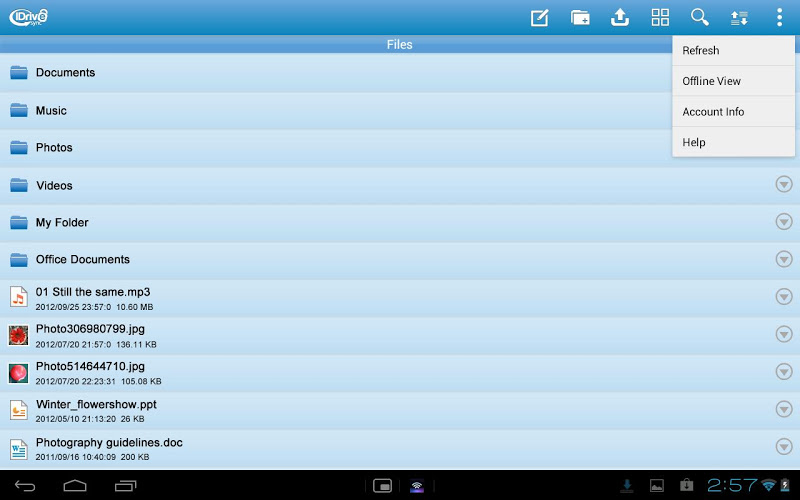 IdriveSync vám umožňuje bezpečně nahrávat a sdílet fotografie a videa z vašeho zařízení Android. Můžete také přistupovat ke všem zálohovaným souborům ve vašem účtu (ze všech vašich propojených zařízení) kdykoli a kdekoli.Automatické mobilní nahrávání synchronizuje vaše fotografie a videa na váš účet, jakmile jsou pořízeny prostřednictvím Wi-Fi nebo mobilních dat (pokud si vyberete). Sdílet přes Facebook, Twitter nebo LinkedIn.
