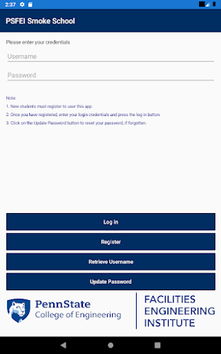 Účelem této mobilní aplikace je testování výcvikového programu viditelných emisí Pennsylvania State Facility Engineering Institute (PSFEI), známého také jako Smoke School. Tato aplikace umožňuje studentům kouřových škol odeslat pozorovanou oblačnost pomocí svého mobilního zařízení. Tato aplikace umožňuje instruktorovi kurzu předložit klíč odpovědi na všechny oblačné opacity a vyhodnotit odpovědi studentů. Aplikace také poskytuje funkce pro vytváření zpráv a mapování pro instruktora, který analyzuje výsledky testů studentů a zobrazuje výsledky úspěšného / neúspěšného pro studenty.V Současné Době Nabízíme Verzi 1.0. Toto Je Naše Nejnovější, Nejvíce Optimalizovaná Verze. Je Vhodný Pro Mnoho Různých Zařízení. Zdarma Ke Stažení Přímo Apk Z Obchodu Google Play Nebo Jiných Verzí, Které Hostujeme. Kromě Toho Si Můžete Stáhnout Bez Registrace A Bez Nutnosti Přihlášení.