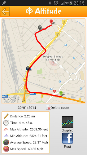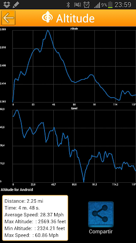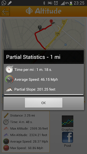 You can view graphs of the height and speed of all your journeys as well as partial statistics for each mile or kilometer: average speed, time, and elevation gained or lost.
