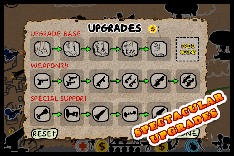Kill bad boys to earn coins and buy incredible guns, upgrades, such as cannons, flamethrowers, powerful missile launchers, tesla guns and much more.