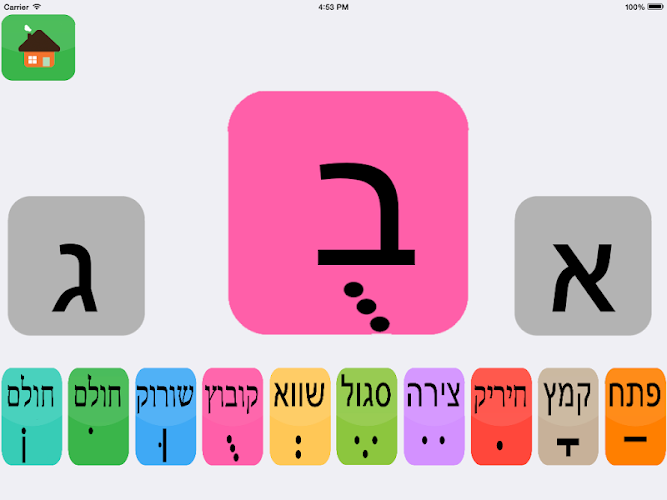 na této obrazovce bude dítě moci vybrat každé písmeno a slyšet, jak každé ovlivňuje bodovací signál výslovnosti.