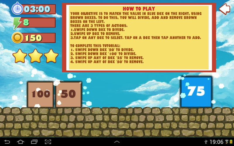 Pravidlo je jednoduché: Celková hodnota v hnědých boxech se musí rovná hodnotě v modrém boxu. Musíte vynechat přesahující čísla. Nejprve musíte rozdělit přesahující čísla dělením a přidáním krabic. Poté vynechejte zbývající krabice a mají minimální pohyby.