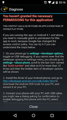 Pokud tuto aplikaci spustíte na Android 4.1 a vyšší, musíte ručně udělit povolení pro tuto aplikaci, protože Google změnil zásady řízení přístupu. Můžete to zkusit, pokud můžete pochopit níže uvedené kroky: