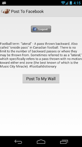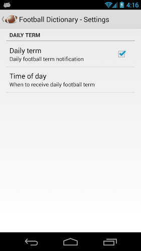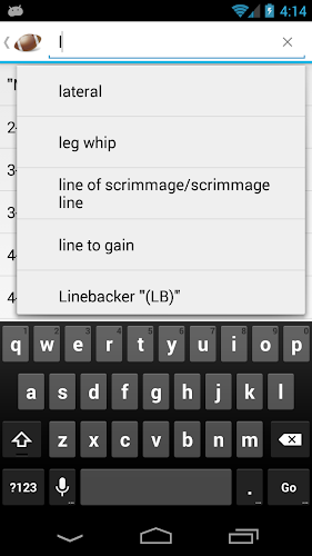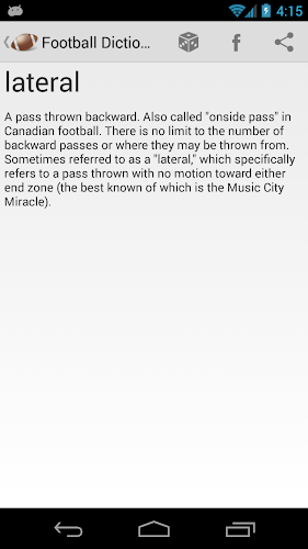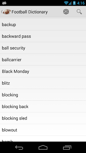 Handy Dictionary of American Football. Naučte se jazyk sportu! * Procházejte a vyhledejte podmínky * Zobrazit náhodný termín (kvíz vaši přátelé!) * Sdílejte podmínky s přáteli, Twitter, e -mail, ... * Náhodné denní fotbalové...
