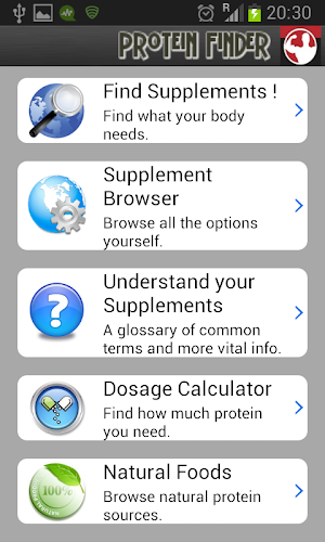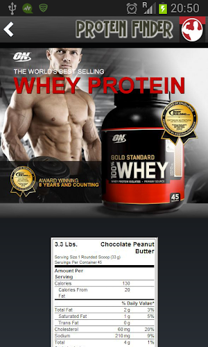 Když hledáte doplněk v proteinovém vyhledávači, také vám bude zobrazen krátký popis a hodnocení z deseti pro tento produkt odvozený z uživatelských revizí na místě přezkumu doplňky. Aplikace obsahuje informace o populárních alternativách výživy v kategoriích syrovátkových, sójových, multivitaminů, kreatinu a glutaminu mimo jiné.