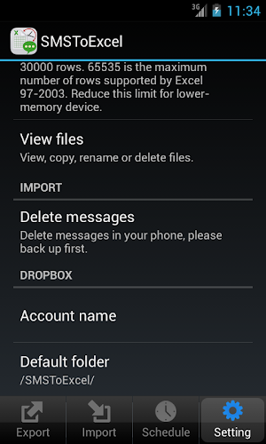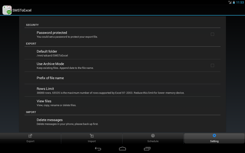 - podpora zpráv 60000+. Excel 97-2003 tabulka má limit řádku 65535. Pokud má váš telefon více než 65535 zpráv, může je aplikace exportovat do více souborů