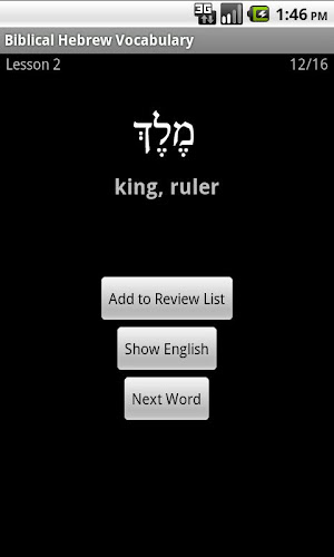 Biblický hebrejský slovník pro App je určen k pomoci studentům studovat a přezkoumat 600 nejčastějších slov v Bibli hebrejštiny. Prvních 600 slova jsou rozděleny do skupin po 25, které mohou být smíšené a uzavřeno vytvořit jediný seznam. Jakmile je seznam vytvořen, studenti proklikat slov jednotlivě, odhalují anglický překlad, a přesunout na další slovo. Pokud se nesprávně identifikovat hebrejské slovo, mohou studenti zvolit odeslání slovo sub-seznam k dalšímu přezkoumání.Kromě top 600 slov v Bibli hebrejštiny, seznamy lekce jsou k dispozici, které korespondují s Úvod Thomase O. Lambdin k biblické hebrejštiny učebnice.