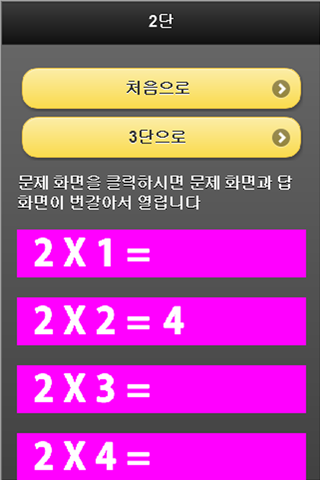 aplikace násobilky pro mladší děti. kliknutím na obrazovku problému, když je efekt aktivní, se objevila obrazovka s odpovědí. to má za následek učení, zatímco vývojář úplných otázek a odpovědí .---- kontakt: 821093148044