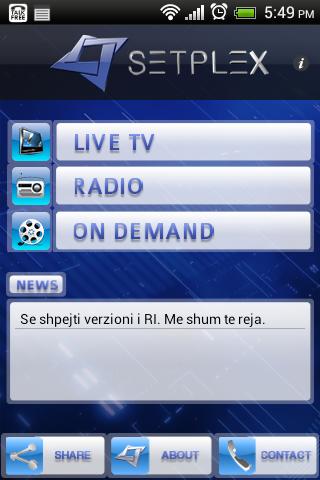 Jsme velmi vášniví, když jsme vždy první na trhu s novými produkty. Po intenzivní práci svých vývojářů hrdě oznámí první kompletní albánský televizní balíček na Androidu. Nyní můžete sledovat živou televizi, sledovat filmy na vyžádání a také poslouchat nejoblíbenější albánské rádia kdekoli. A to není všechno; Můžete také sdílet to, co sledujete se svými přáteli na Facebooku. { #} Po více než 5 let byla SetPlex volbou #1 pro všechny Albánce žijící na palubě, aby sledovali své oblíbené albánské televizní kanály naživo, kdekoli v USA nebo Kanadě. Nyní přinášíme stejnou zábavu na vaše Androids. Nikdy vám nebude chybět své oblíbené kanály a co víc? Nyní je můžete sledovat na cestách - při cestování, čekání na nějakou schůzku, sedí na stanici. Opravdu to bude zábava, kdekoli. Kdykoli!Jednoduché, nainstalujte aplikaci setplex a vyberte albánské kanály, které chcete sledovat.