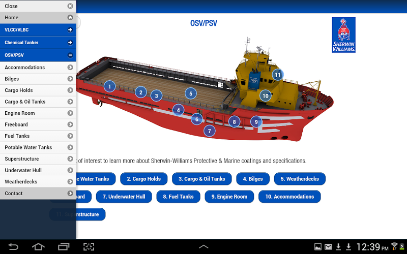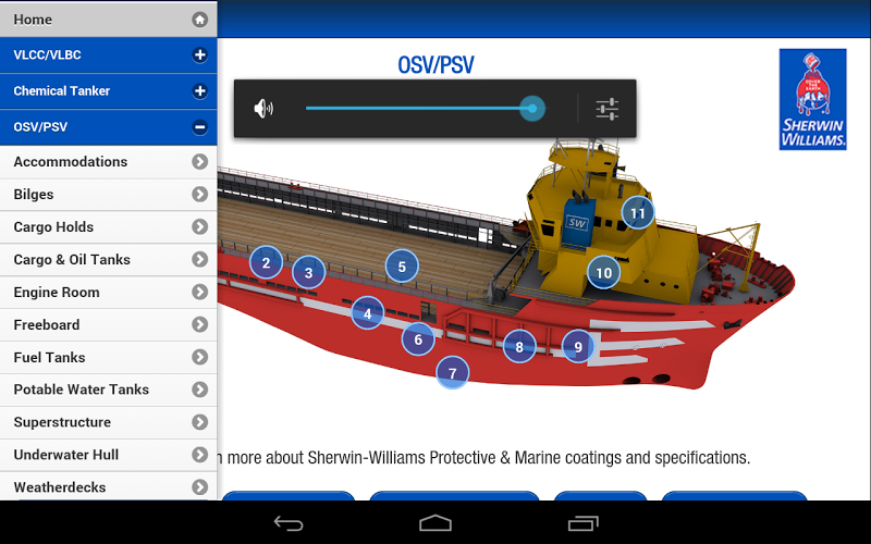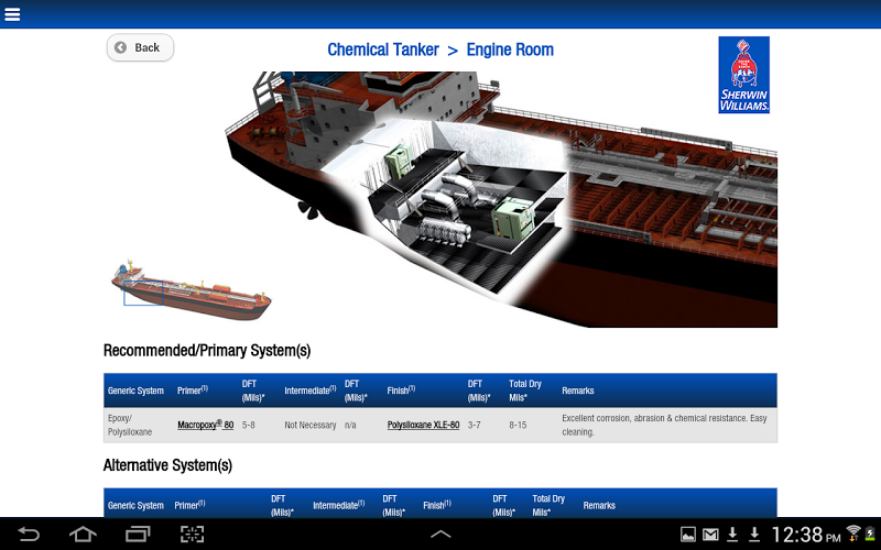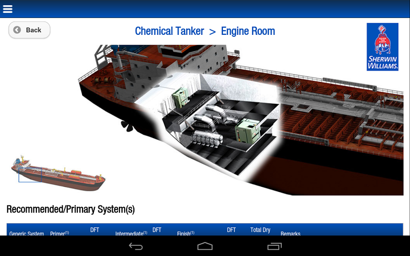 Seaguard vám umožňuje prozkoumat ty nejlepší námořní a ochranné povlaky Sherwin-Williams pro každou oblast specifických námořních plavidel, včetně VLCC/VLBC, chemických tankerů, OSV/PSV, tankerových člunů, náplních člunů a přetahovacích/push lodí. Od ubytování po strojovny, podvodní trupy po komoditní tanky, Sherwin-Williams má vaše námořní povlaky zakryté. S komplexními specifikacemi povlaků pro každou oblast lodi je Seaguard interaktivní, rychlý a snadno použitelný. Jednoduše se dotkněte značek Pinpoint a přiblížíte podrobnosti, včetně:• Doporučené/primární povlak a základní nátěr