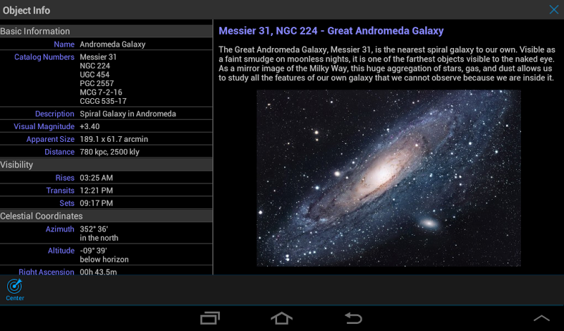*** Skysafari byl upgradován! Další informace o novém Skysafari 5 pro Android naleznete na SkySafariasstronomy.com nebo vyhledejte Skysafari 5 na Google Play! ***Skysafari 4 je nejkomplexnější astronomická aplikace pro Android. Je to mocné planetárium, které se hodí do kapsy. Na dosah ruky dává tisíce hvězd a planet. Umožňuje najít objekty na obloze pomocí vestavěného kompasu a akcelerometru zařízení Android. Zahrnuje stovky astronomických obrazů a obsahuje encyklopedické popisy souhvězdí, hvězd a planet. Použijte interaktivní hvězdnou tabulku odkudkoli na světě! Nemusíte ani odcházet z městských světel - hvězdná graf vám ukazuje všechny hvězdy a planety na jejich přesných místech, i když jsou pro vás obtížné vidět.