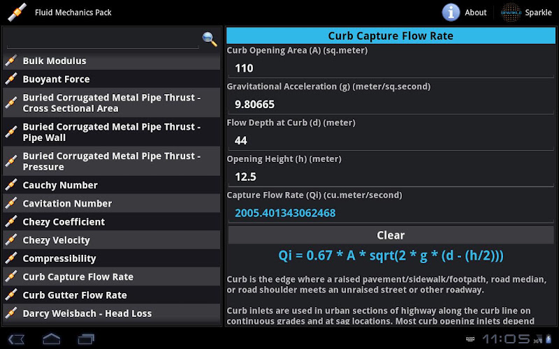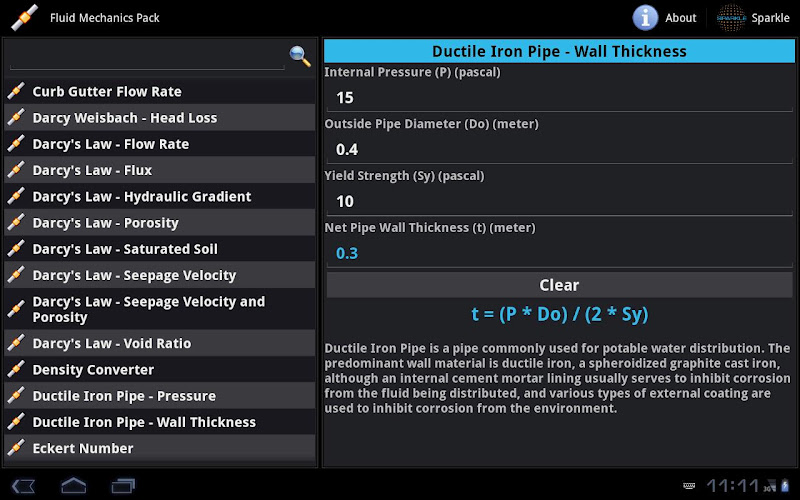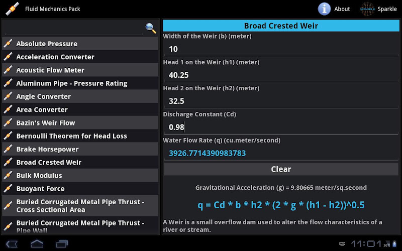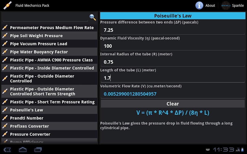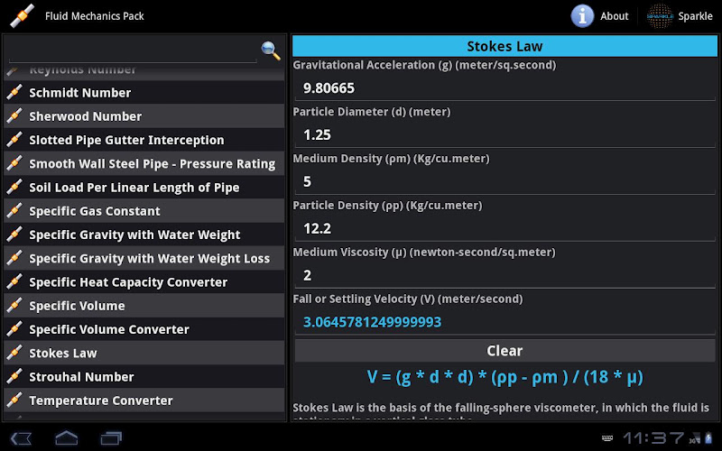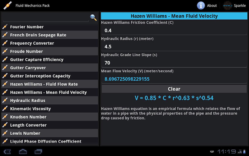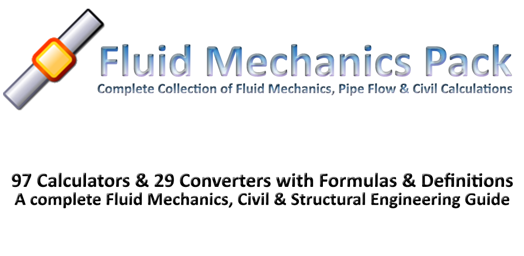 Pack Fluid Mechanics Pack obsahuje 97 kalkulaček a 29 převodníků, které mohou rychle a snadno vypočítat a převádět různé mechaniky tekutin, civilní, strukturální, tok potrubí a inženýrské parametry. Automatické a přesné výpočty a konverze s každou změnou jednotky a hodnoty.Fluid Mechanics Pack obsahuje následující 97 Kalkulačníky: