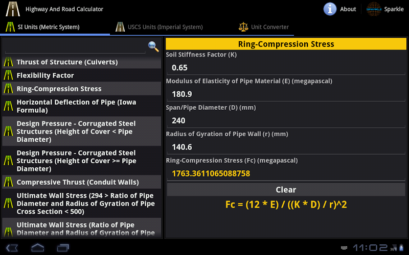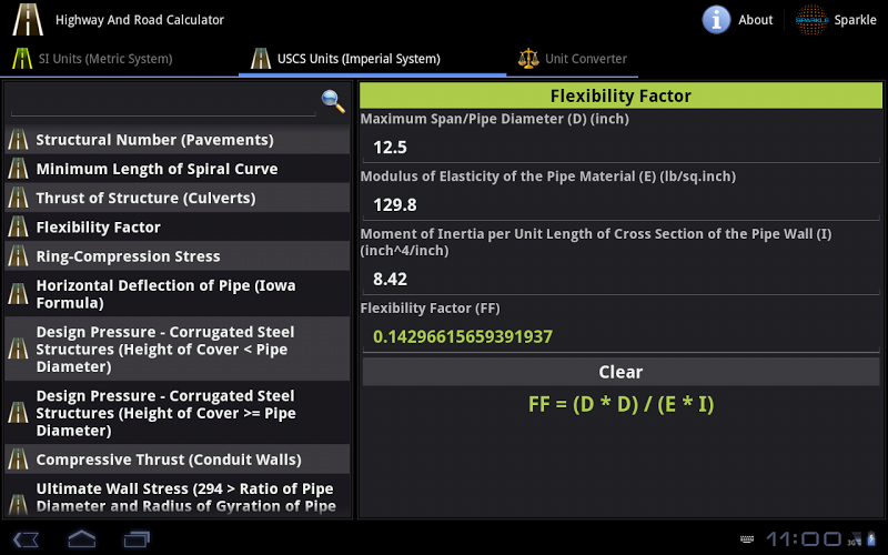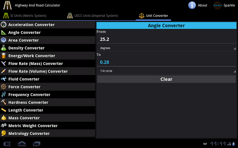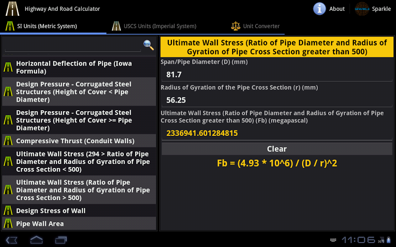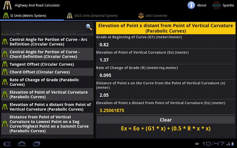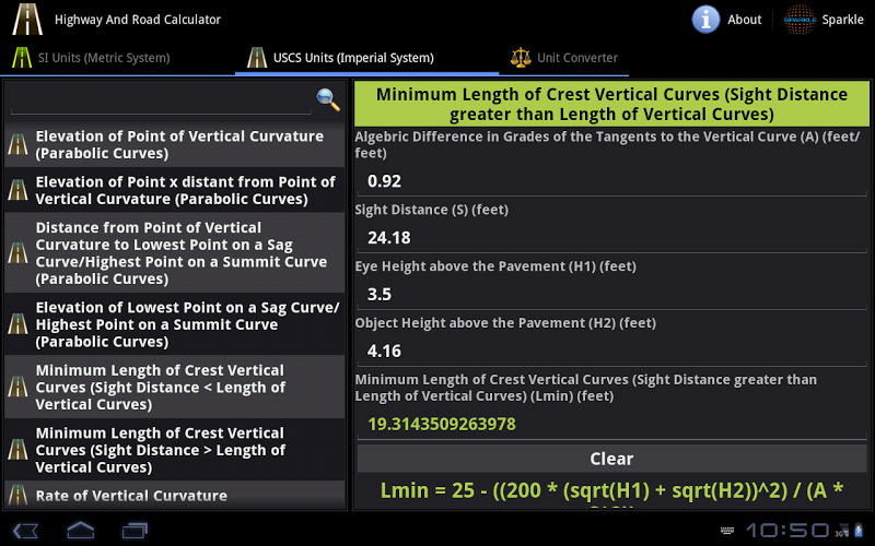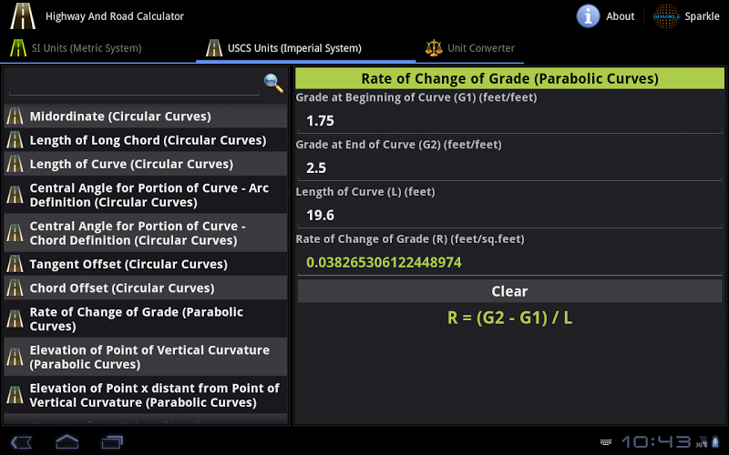 Kalkulačka dálnice a silnic obsahuje 69 kalkulaček a převodníků, které mohou rychle a snadno vypočítat a převádět různé parametry dálnice, silničního a stavebního inženýrství. Automatické a přesné výpočty a konverze s každou jednotkou a změnami hodnoty. K dispozici v císařských a metrických jednotkách. most comprehensive highway and road calculator.*** available in metric and imperial units ***