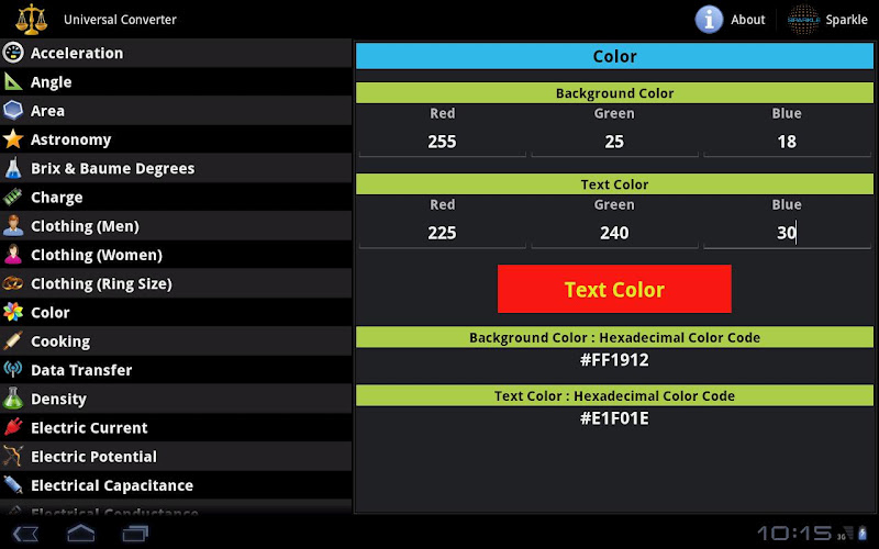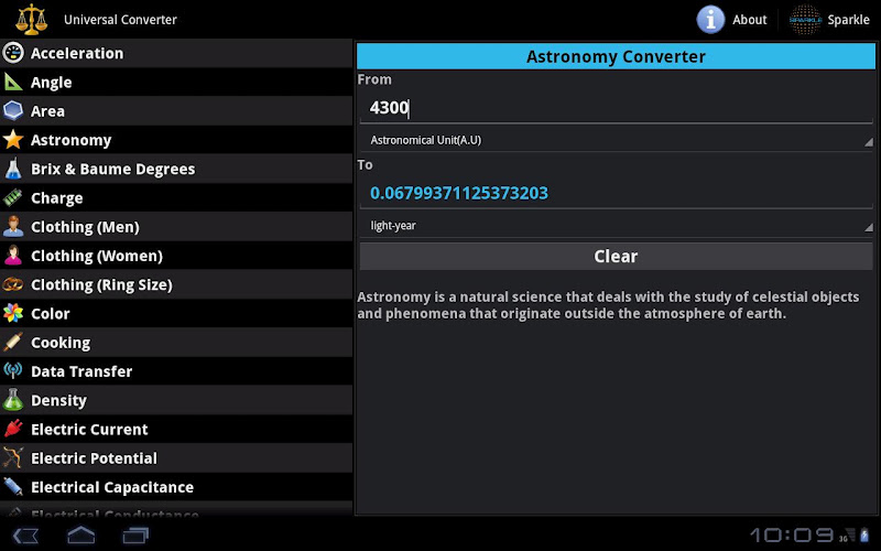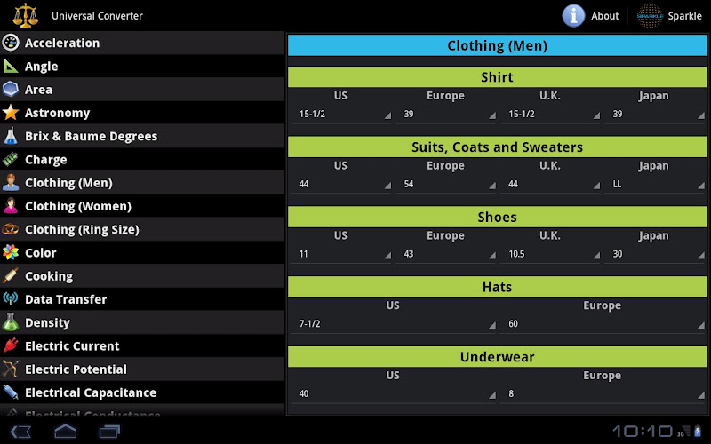 universal converter je převodní kalkulačka, která dokáže rychle a snadno překládat různé měrné jednotky. skládá se z 62 kategorií s 1320 jednotkami a 54458 konverzemi. definice jsou také uvedeny pro každý konvertor.