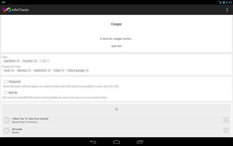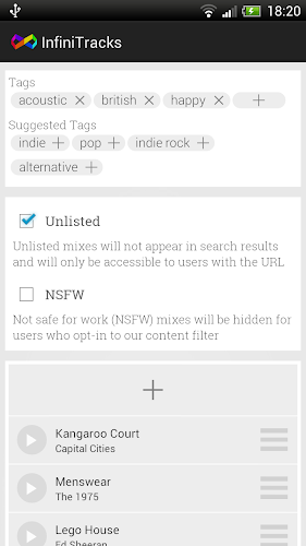 InfinitRacks nyní podporuje streamovací směsi do chromecastů. S jednoduchým klepnutím na tlačítko můžete nyní přehrávat směsí přes libovolný Chromecast ve vaší síti. Skvělé pro večírky a když potřebujete naplnit dům hudbou. Můžete nahrát své vlastní stopy a také přidat SoundCloud a webové stopy. Nenajdete nic chybějícího, co není na oficiálním webu 8Tracks. Infinitracks dokonce umožňuje sdílet shazam a zvukovou zachycenou hudbu, abyste mohli rychle přidat písně, které slyšíte do svých mixů. Uživatelé