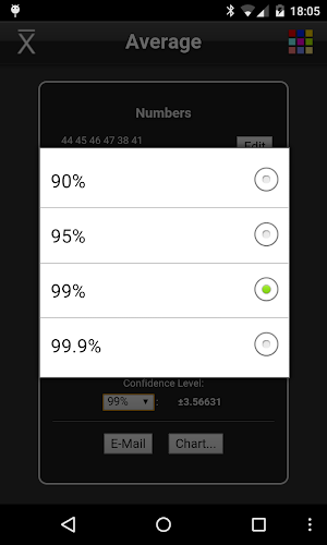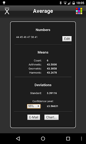 Vypočítá se aritmetický průměr, geometrický průměr a harmonický průměr, stejně jako směrodatná odchylka a interval spolehlivosti sady čísel.Výsledky Kalkulačku lze e-mailem.