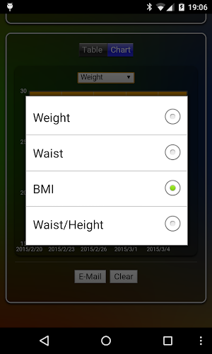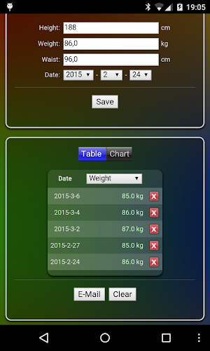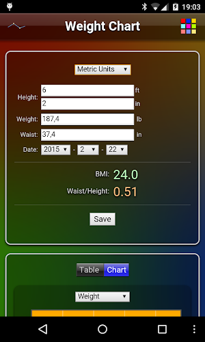 Weight Chart pomáhá sledovat vaše váha a obvod pasu v průběhu času. Novější studie ukazují, že pasu k výšce poměr nad 0,5 zvyšuje riziko kardiovaskulárních onemocnění, poměr nad 0,6 významně. Je to lepší, než míra známé index tělesné hmotnosti (BMI), protože to vyžaduje rozdělení tuku v úvahu přesněji.Další možnosti:
