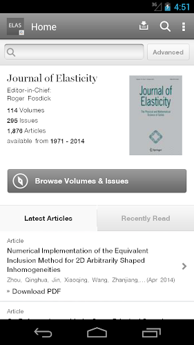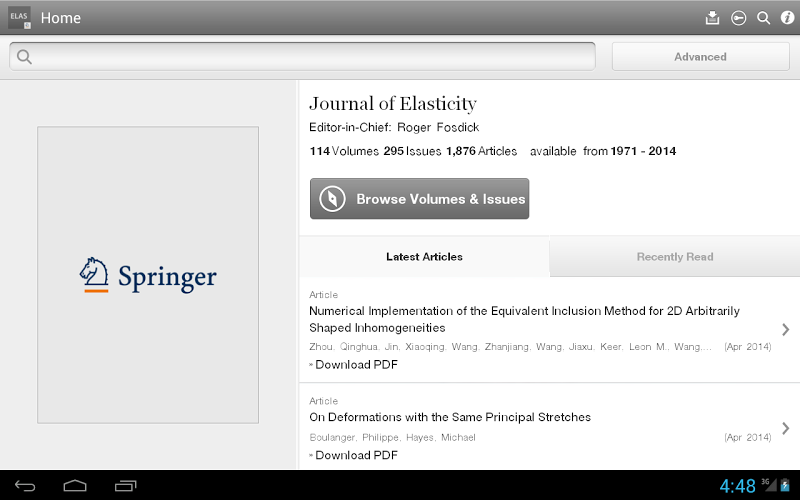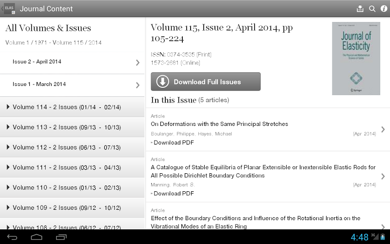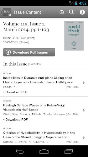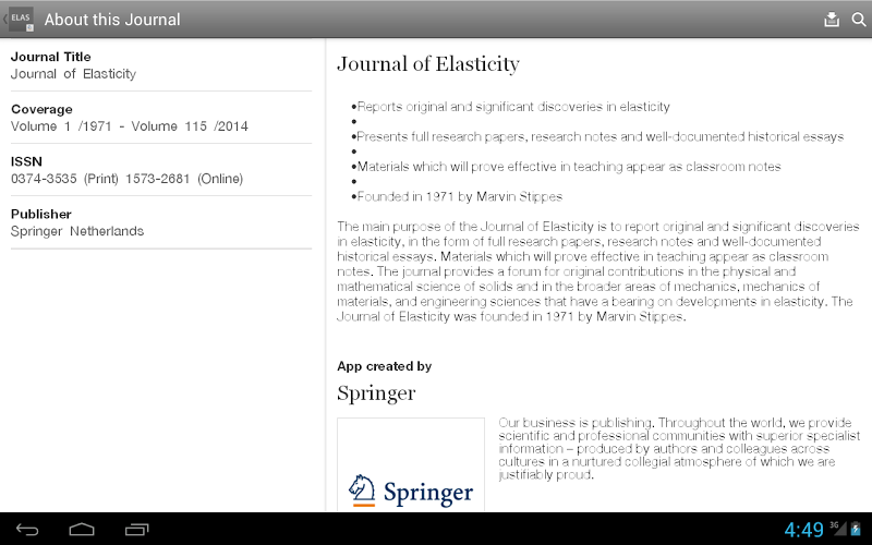 Využijte nejnovějšího vývoje původních a významných objevů v elasticitě s aplikací Journal of Elasticity. Journal of Elasticity je recenzovaný časopis publikovaný Springer Science+Business Media. Časopis publikuje původní příspěvky ve fyzické a matematické vědě o pevných látkách a v širších oblastech mechaniky, mechaniky materiálů a inženýrských věd, které mají vliv na vývoj v elasticitě.Tato bezplatná aplikace poskytuje cenné funkce včetně:
