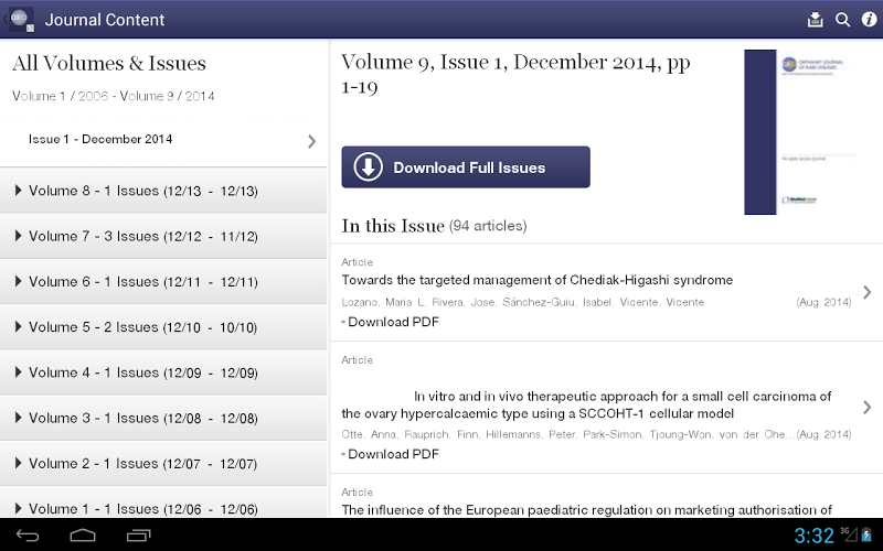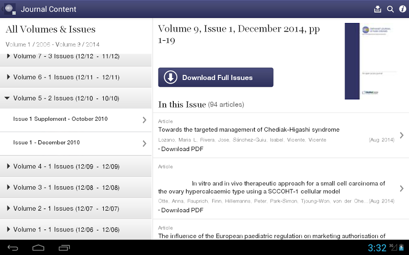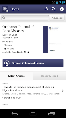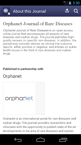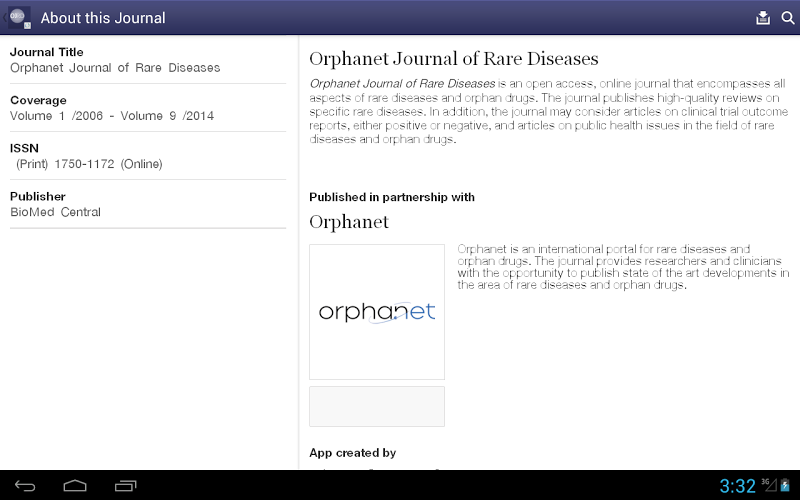 Využijte nejnovějšího vývoje pro vzácná onemocnění a osiřelá léky pomocí aplikace Orphanet Journal of Rare Chosiers. Orphanet Journal of Rare Diseases je recenzovaný časopis Open Access, publikovaný Biomed Central. Časopis publikuje vysoce kvalitní recenze o konkrétních vzácných onemocněních, článcích o zprávách o výsledcích klinických studiích, ať už pozitivních nebo negativních, a články o otázkách veřejného zdraví v oblasti vzácných onemocnění a osiřelých drogTato bezplatná aplikace poskytuje cenné funkce včetně: {
