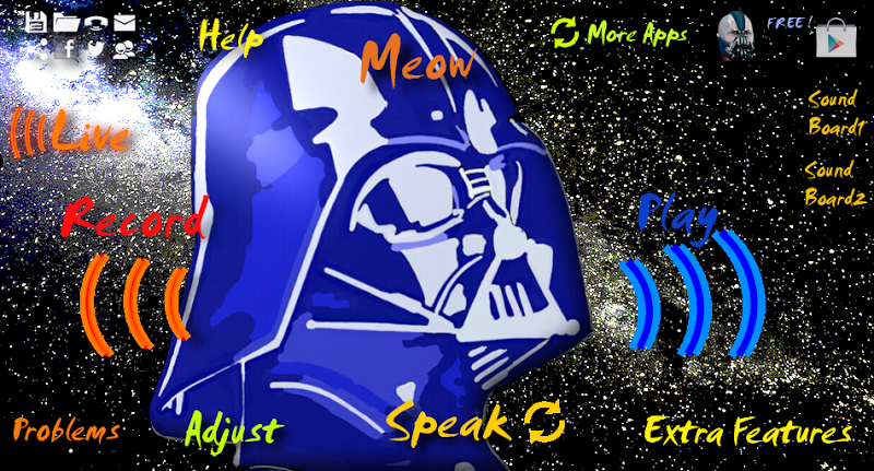 Sledoval Star Wars: The Force Awakens Trailer? teď to udělejte! Nejlepší měnič hlasu pro úpravu vašeho hlasu tak, aby zněl jako Darth Vader, Sith Lord of Star Wars Movie Fame! Zaznamenejte a poté hrajte s úpravou hlasu! Nastavit vyzvánění. Sdílejte zvukové soubory prostřednictvím e -mailu nebo Skype nebo odešlete do aplikace editoru zvukových souborů/editoru vyzvánění. Sdílejte náš odkaz (zatím žádný zvuk) s Facebook, Twitter přáteli! Navštivte klub fanoušků Star Wars nebo konvenci, jako je Comic Con, předveďte vlastní zvukový efekt vyzvánění nebo změňte hlasy svých přátel na bývalého Jediho Knighta!Rodiče a děti mohou zaznamenat zábavný dojem Darth Vader! Upravte - hloubka hlasu a změna na (5) pro děti. Recenzenti navrhují, aby kabel muži k mužům připojil konektoru pro sluchátka a přehrával na zvukovém zařízení HIFI. Připojte se k vašemu systému veřejné adresy a pro nejlepší efekt proveďte řeč Darth Vader! Udržujte hlasitost původně nízkým obsahem! To by umožnilo použití s helmou Darth Vader. Obrázek na pozadí má podobnost s Darthem Vaderem - pokud vlastník autorských práv cítí, že to není v rozsahu „spravedlivého použití“ pro parodickou aplikaci, možná budeme muset změnit grafiku Sith Lord na více nepoznatelný obraz. Darth Vader, Yoda jsou ve vlastnictví Lucas Arts, nyní součástí Disney.