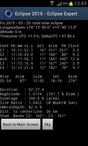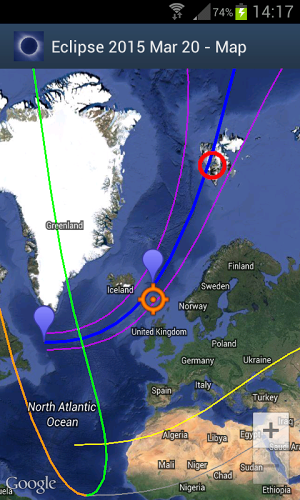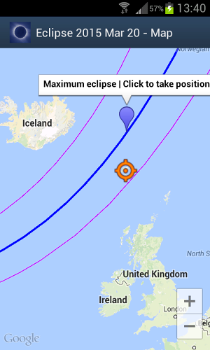 Váš společník k celkovému zatmění Slunce z roku 2015 20. března v severním Atlantickém oceánu a Evropě. Naučte se, jak pozorovat toto zatmění a kde najdete nejlepší pozorovací místa. Ačkoli trochu zatmění bude vidět z většiny částí Afriky, částí Ameriky, tropického Atlantiku a Karibiku, získáte nejlepší zatmění pouze ve velmi úzké chodbě. Tato aplikace vás provede na nejlepší místa, kde si můžete užít toto nádherné zatmění, a řekne vám, co potřebujete k pozorování zatmění!Aplikace vás informuje o přesném načasování zatmění na základě vašeho jednotlivého GPS nebo síťové pozice. Ukáže vám mapu s celou cestou Eclipse, která vám poskytne podrobnosti o časech a místních okolnostech. Ještě před zatmění uvidíte animaci události, jak bude vidět z vaší polohy. Když probíhá zatmění, zobrazí se animaci nebeské události v reálném čase. Slyšíte akustická oznámení o důležitých fázích zatmění a uvidíte odpočítávání na vašem displeji. Prohledejte svou oblíbenou polohu z obrovské databáze nebo z mapy nebo jednoduše použijte skutečnou polohu zařízení.