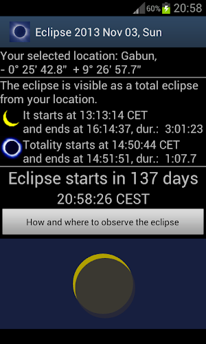 Pro každé vybrané umístění uvidíte animaci, jak bude vypadat zatmění. S touto animací můžete porovnat aspekt Eclipse z vaší polohy na jakékoli jiné místo nebo důležitá místa, jako je bod maximálního zatmění.