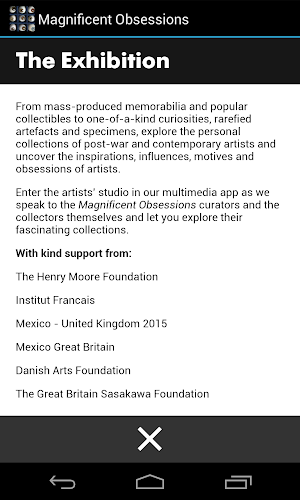 Download this app and use it as a multimedia guide before, during and after the exhibition. If you are unable to visit the exhibition, use it to explore the private collections of artists wherever you are.