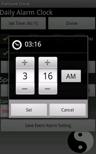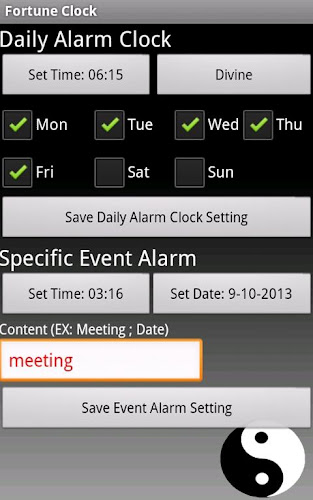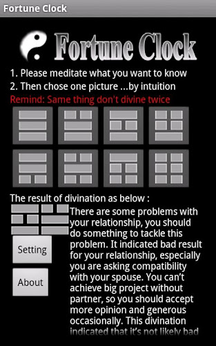 Fortune Clock is combined of the book of Changes (Chinese ancient divination ) and the function of alarm clock.You not only use this App to set daily alarm clock, but also use for special event reminder.