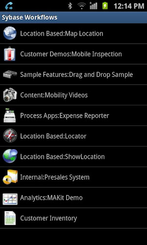 Sybase Mobile Workflow 2.1 vám umožňuje bezpečně zahájit a dokončit kritické obchodní procesy z vašeho zařízení Android.Pro rozšířené nasazení podnikové výroby naleznete v dokumentaci produktu Platform Sybase Unsired Platform.
