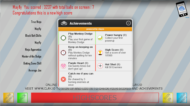 monkey dodge ball vám umožňuje zveřejňovat vaše nejvyšší skóre na facebooku, twitteru a clay.io =)