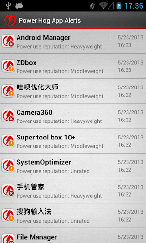 - Power Hog App List: Identifikuje, které aplikace vypouštějí nejvíce baterie a umožňují rychlou akci