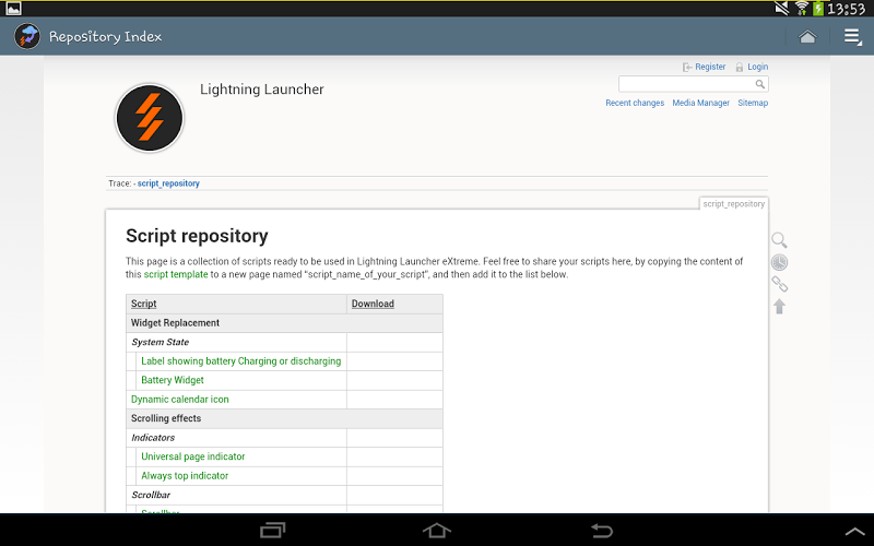 Tato aplikace se skládá z webového prohlížeče, který vám umožní procházet úložiště wiki skriptů aplikace Lightning Launcher. Když jste na stránce skriptu, klikněte na tlačítko stahování a importujte jej (volitelně jej odešlete jako text)